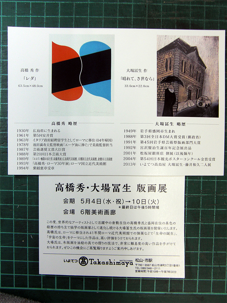 ゴールデンウイークが始まりましたね。四国の方々にお知らせです。5月4日〜いよてつ高島屋におきまして「高橋秀・大場冨生 版画展」が開催されます。今回は70年代の版画を中心に展示いたします。秀先生の作品を四国で見られるのは貴重なことだと思います。近隣の方々はお時間がございましたらぜひ足をお運びください。なお秀先生の在廊予定はありません、あしからず。高橋秀・大場冨生 版画展2016年5月4日(水・祝)〜10日(火)いよてつ高島屋 6階美術画廊790-8587 愛媛県松山市湊町5-1-1tel:089-948-2111