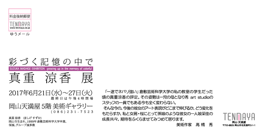 スタッフの真重 涼香の展覧会の案内です。DMの高橋秀先生の言葉より 「一途でネバリ強い」倉敷芸術科学大学の私の教室の学生だった頃の真重涼香の評定。その姿勢は一児の母となり秀 art studioのスタッフの一員でもある今も全く変わらない。 そんな今の、今後の彼女のアート表現がどこまで伸びるか、どう変化をもたらすか、私と女房・桜にとって孫娘のような彼女の一人娘采佳の成長共々、期待をふくらませてみつめて居ります。美術作家 高 橋 秀」真重 涼香の天満屋での初個展です。今回は100号の大作を中心に披露します。★☆★☆★☆★☆★☆★☆★☆★☆★☆★☆★☆★☆★☆彩づく記憶の中で 真重 涼香展2017年6月21日(水)~27 日(火)岡山・天満屋 美術ギャラリー〒700-8625岡山市北区表町2丁目1番1号TEL:(086)231-7111(代表)