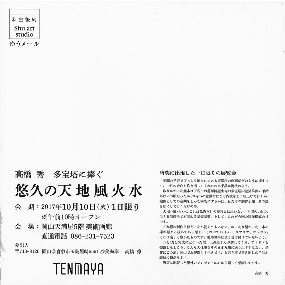 高橋秀先生が1年以上もかけて制作してこられた熊本県玉名市、蓮華院誕生寺 多宝塔のための内壁装飾画の展覧会が急遽決まりました。